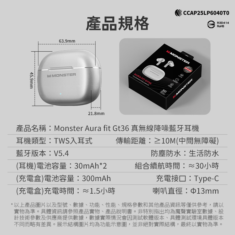 產品名稱:Monster Aura fit Gt36 真無線降噪藍牙耳機