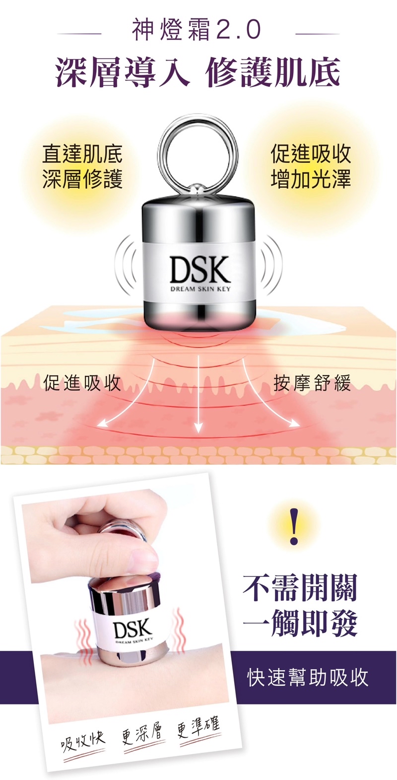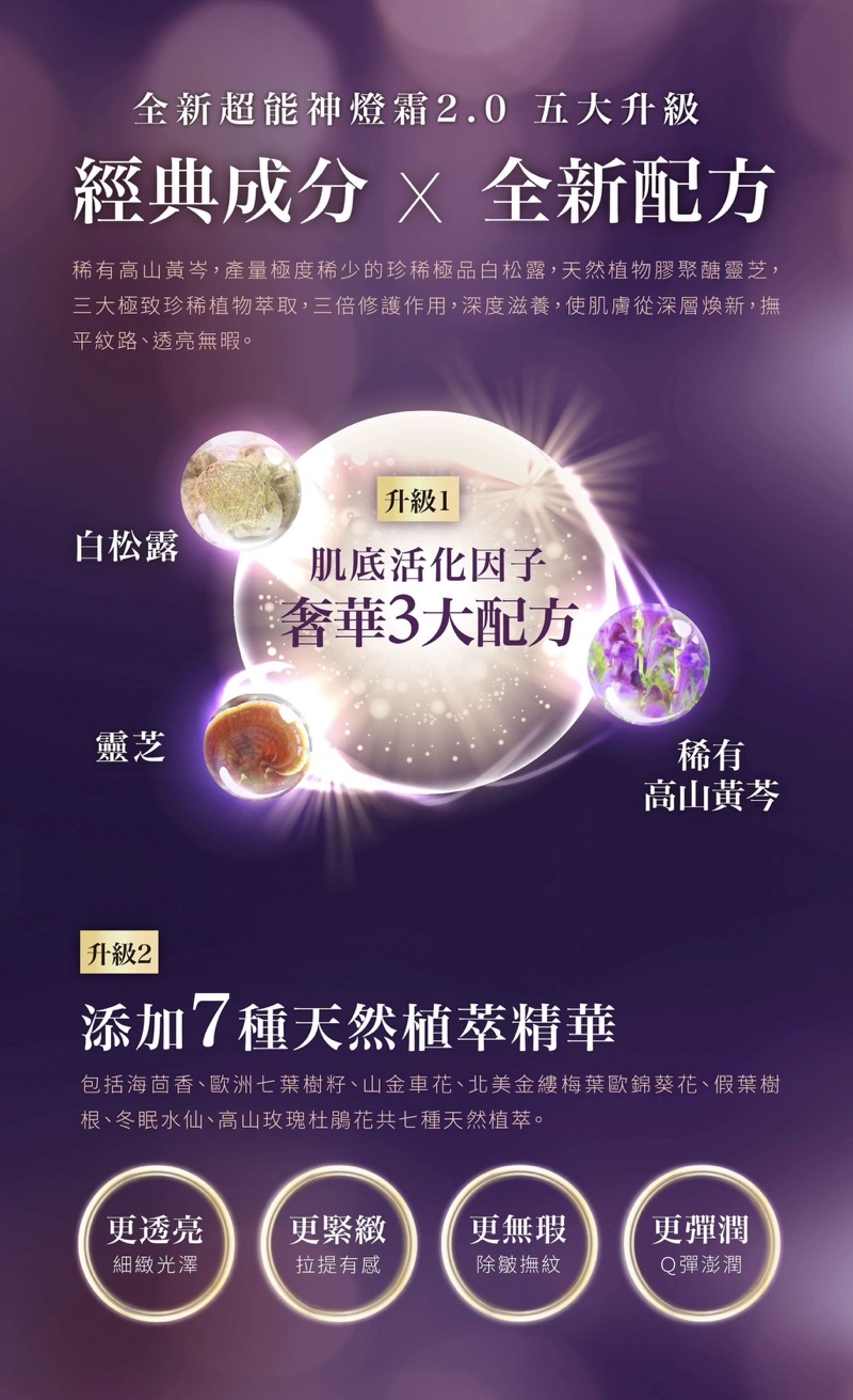 拉提、亮白、緊緻、撫紋四大功效全面升級外,更增加 彈潤力、修復力、防禦力三大效能,高效還原使肌膚透、亮、滑、潤,全新超能神燈霜2.0,迅速擊退黯沉老化,全面回復青春光采,讓妳維持完美,感受年輕