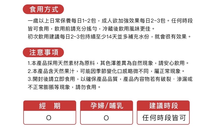 每日1次,每次1~2包,飲用前請充分搖勻,冷藏後飲用風味更佳