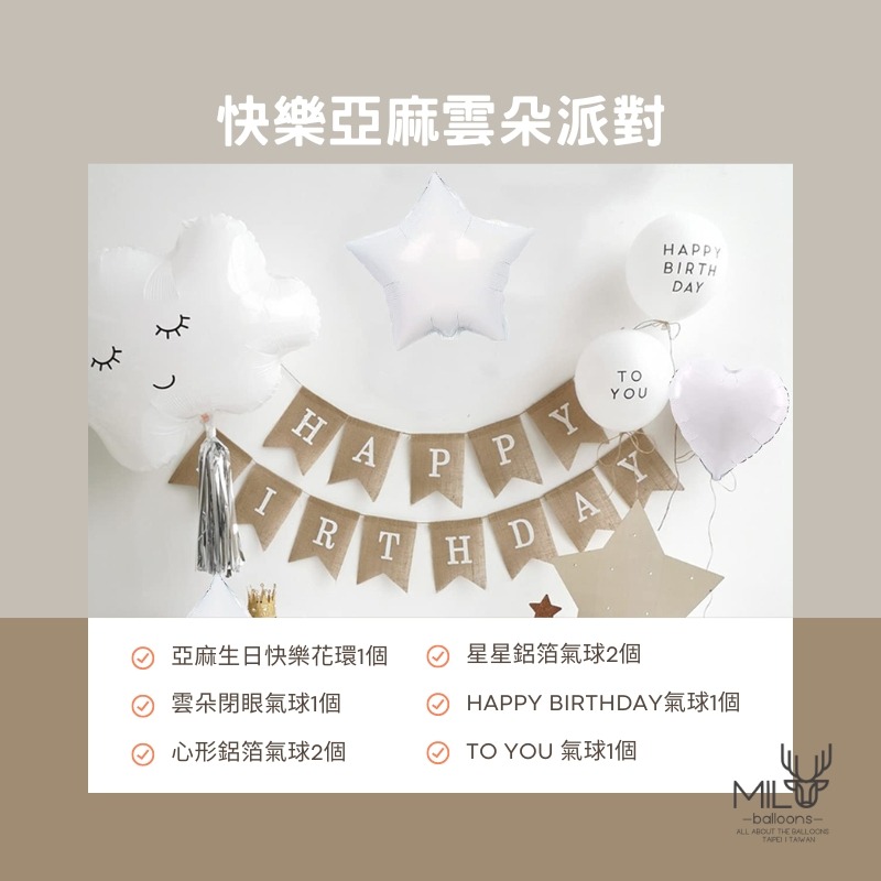 【套組內容】:1個生日快樂拉旗(亞麻材質)+1個可愛的雲朵氣球+2個心形氣球+2個星星氣球+2個HAPPY BIRTHDAY TO YOU氣球,共8個生日裝飾品 一套。