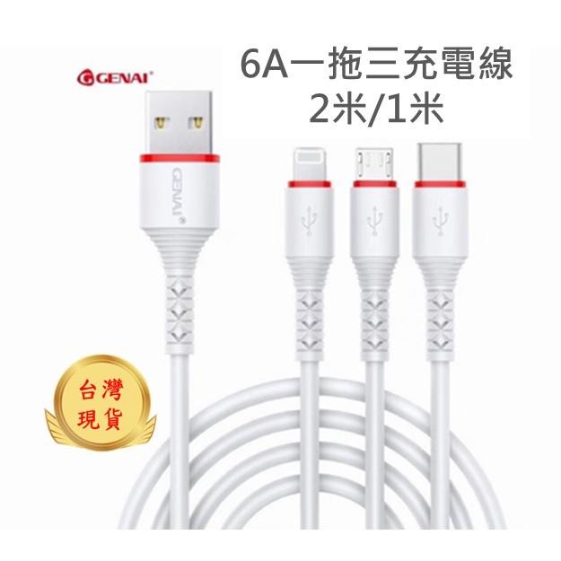 6A快速一拖三充電線 蘋果 安卓 Micro B 三合一充電線 耐彎折護頸設計 1米 2米線長