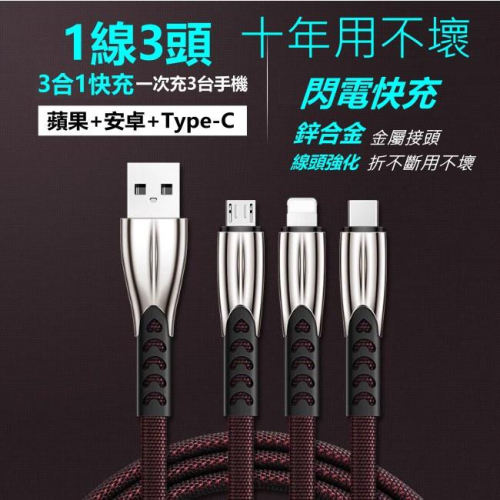 bk 真耐用 快充 3合1 鋅合金 編織線 一拖三 充電線 傳輸線 快充線 安卓 蘋果 Type-C 三星 OPPO
