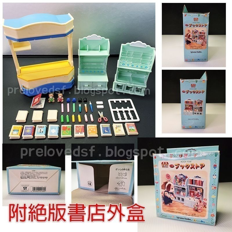 森林家族1998年絕版書店配件(如圖)。二手附外盒,盒況不完美。兩組湖水綠書櫃/展示架上方無貼紙,需自行製作改造。其他迷你小配件物況不一,有的塑膠書封面貼紙較舊,部分迷你配件缺貼紙。