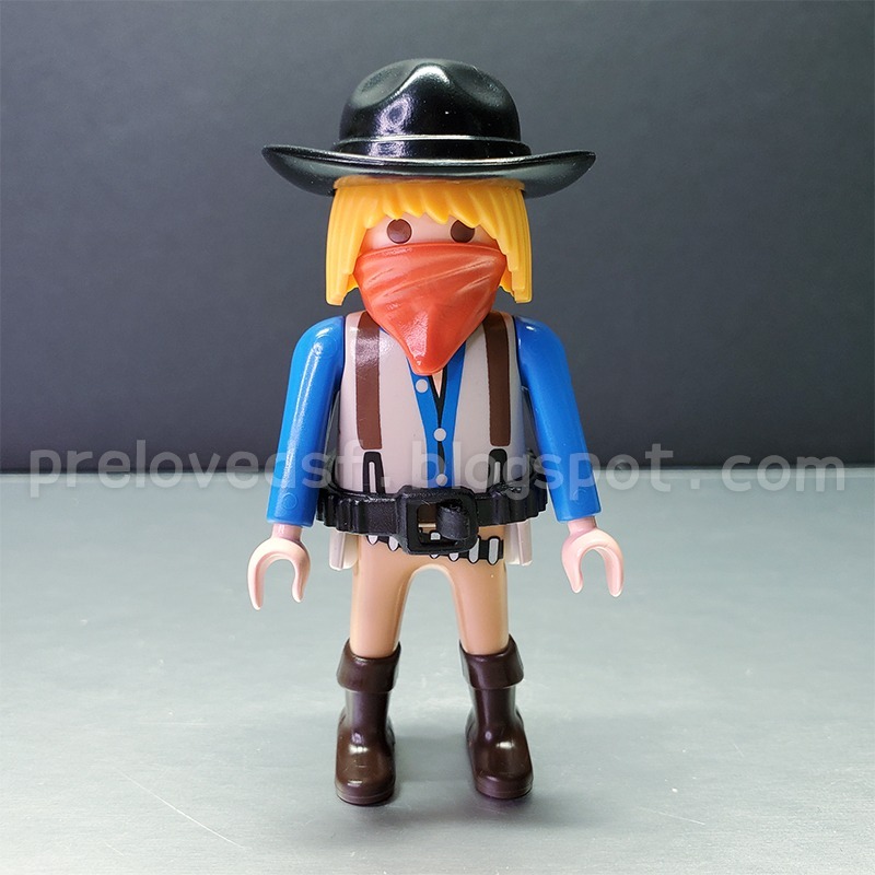 Playmobil 5248 西部系列摩比人偶 X1。男性強盜裝扮、橘色面罩、黑色帽子、腰部有腰帶槍套、上衣仿吊帶塗裝、奶茶色長褲、咖啡色靴子。帽子、橘色面罩可快拆。二手無盒保存佳。私人收藏,無退換貨服務,完美主義者請繞道。