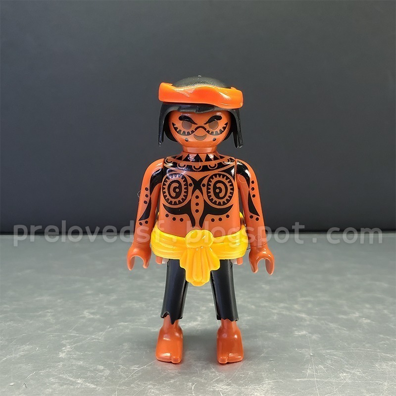 Playmobil 5137 海盜系列摩比人偶 X1。焦糖膚色,臉部與身體都有刺青塗裝,頭部有頭帶配件、腰部黃色腰帶、赤腳。二手無盒保存佳。私人收藏,無退換貨服務,完美主義者請繞道。