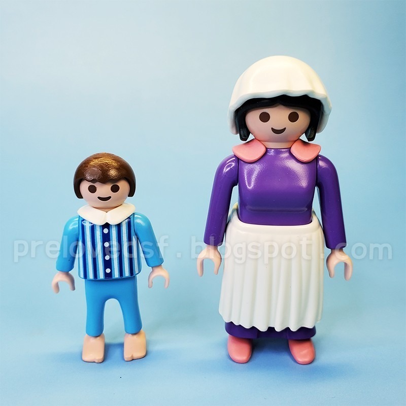 Playmobil 5324 維多利亞系列,浴室組合(紫盒)裡的摩比人偶 X2。並非後來的復刻版 70895,收藏已久,有歲月痕跡。女性摩比附帽子、衣領、圍裙。小朋友尺寸摩比人偶也有立體衣領,他的頭部有較明顯的痕跡,入手時就如此,介意者勿下單。二手無盒,私人收藏,無退換貨服務,完美主義者請繞道。