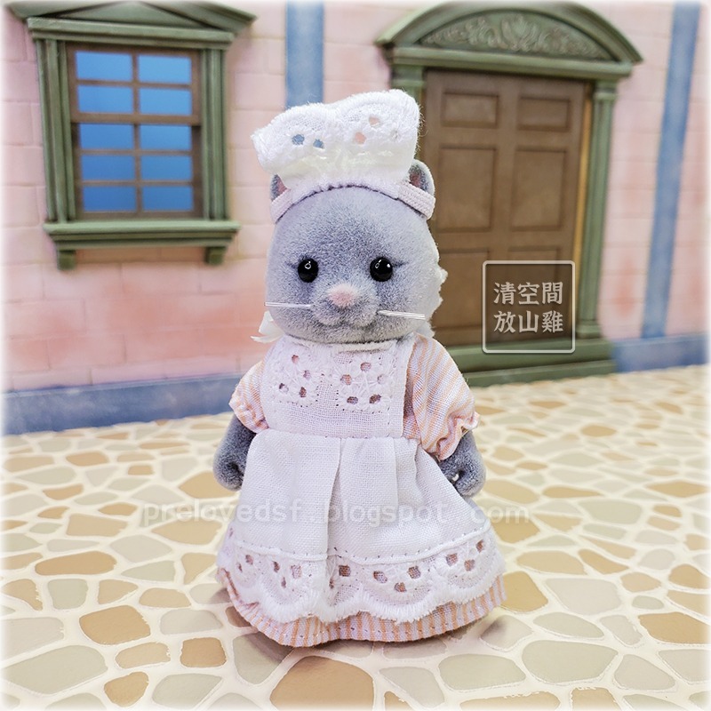 Sylvanian Families 森林家族貓咪玩偶 X1。二手無盒。灰色泡芙貓媽媽(Suzette Simpkins)在英版 TOMY 與 Flair 時期都出現過,與褐色老鼠 Basil 搭檔出過組合。已絕版的紅色大飯店 Regency Hotel 也曾附過這隻玩偶。爬網路資訊最早可能出現在 1993~1994年。