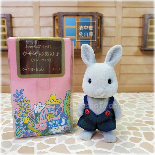Sylvanian Families 森林家族絕版灰兔玩偶 X1。二手有盒。1985年灰兔家族裡的灰兔男孩。(シルバニアファミリー ウサギの男の子 グレータイプ ウ-13)