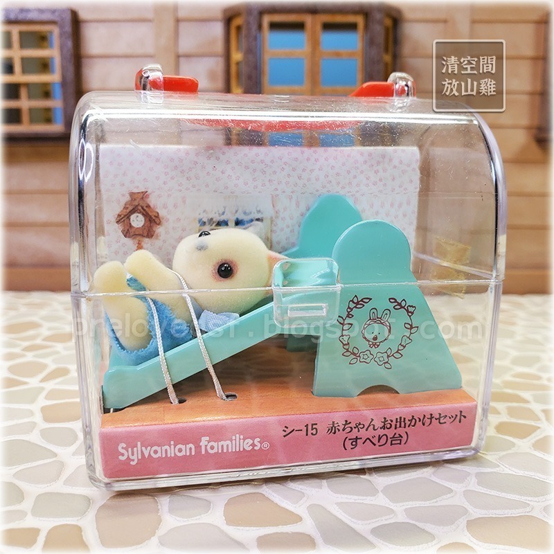 Sylvanian Families 森林家族寶寶提盒 X1。二手有提盒。這盒三色貓寶寶與溜滑梯提盒是日版約1995年的絕版品。赤ちゃんお出かけセット(すべり台)シ-15