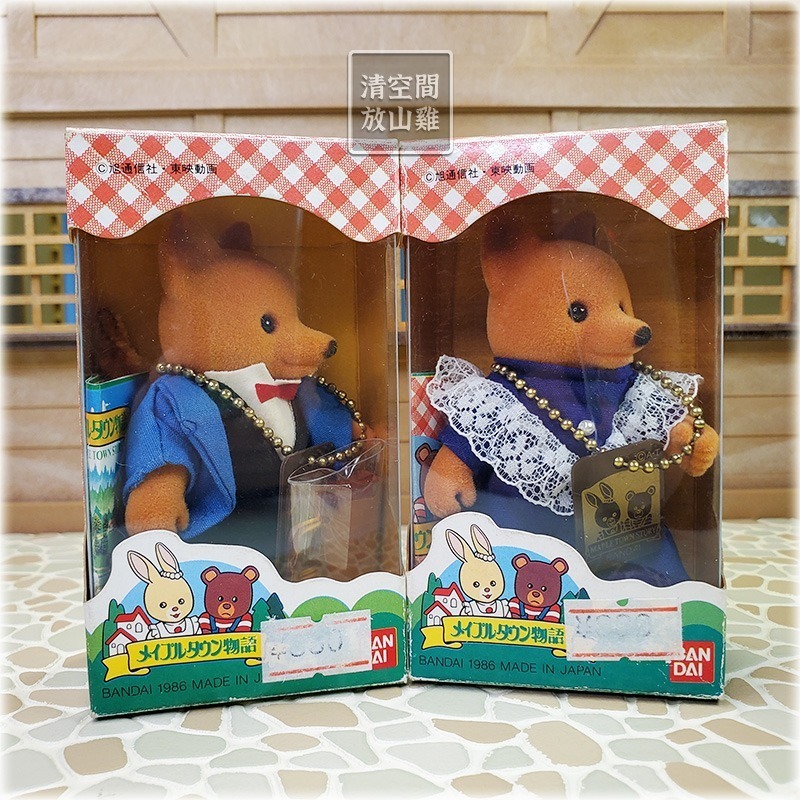 可和森林家族玩偶房屋家具一起玩的 Maple Town Story《楓葉鎮物語》絕版狐狸植絨玩偶 X2。二手有外盒。這兩隻狐狸植絨玩偶是 1986年日本電視動畫《楓葉鎮物語》的周邊商品(メイプルタウン物語 メイプルフレンド キツネ ダイアナのパパ ダイアナのママ)。狐狸爸爸、狐狸媽媽各一隻,他們的手都是可持物的,兩隻外盒都標示 MADE IN JAPAN。外盒為紅標 BANDAI 商標,可惜此IP沒有延續下來。