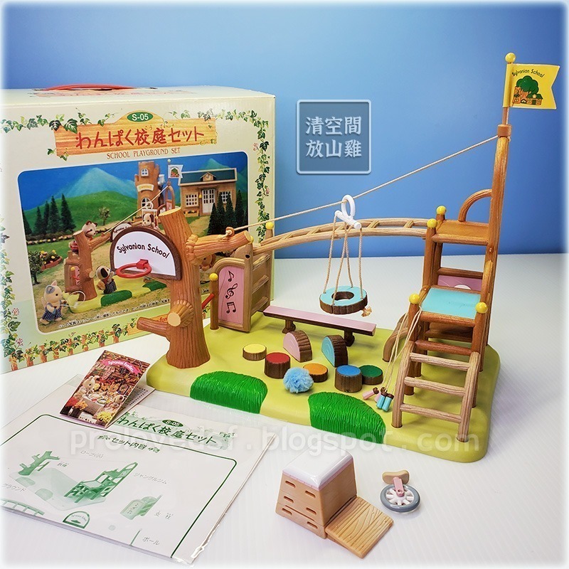 Sylvanian Families 森林家族校園遊具組、跳箱、獨輪車。校園遊具組二手有盒、跳箱獨輪車組二手無盒。森林家族校園遊具組為1998年日版「わんぱく校庭セット S-05」;跳箱與獨輪車為2003年英版 Flair #4350 Marjorie's Gymnastics Lesson 裡的配件。