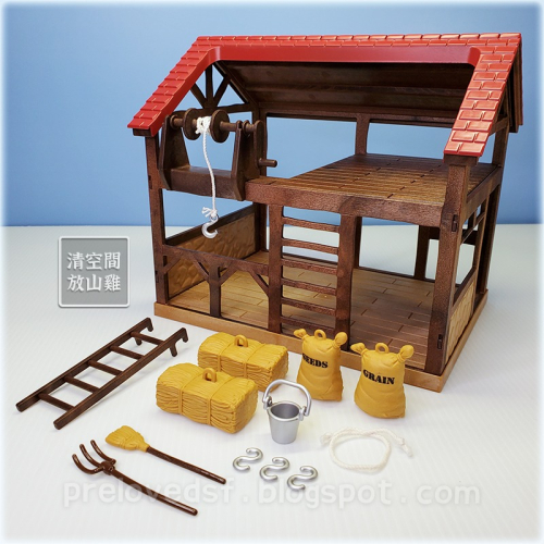 穀倉本體乾淨保存良好,裡面有個圓形燈座可自行裝燈。部分配件是軟塑膠容易變形,其中稻草叉與掃把握柄明顯變形。