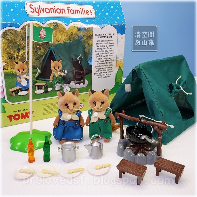 Sylvanian Families 森林家族早期狐狸露營組。二手有盒。狐狸露營組為早期TOMY版本 #3406 Baden & Mikaela's Camping Set,查資料年份可能是1995年的老物。