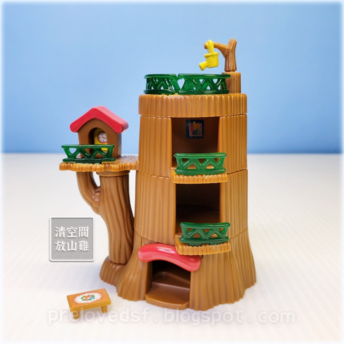 樹屋第二層與最上層可旋轉開,最上層與頂端的小樹枝可快拆,圍欄與其他層不知道可不可以拆,怕弄壞從來沒有拆過。有一張迷你小桌子不確定是不是這組樹屋的配件,一起附上。無其他配件。不含圖中森林家族乳牛玩偶與尺,參考比例用。