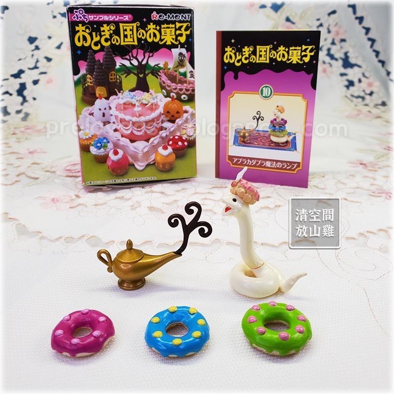 Re-Ment 2007年絕版食玩童話王國點心(おとぎの国のお菓子)。此賣場單售10號。二手有盒有紙。外盒不完美有歲月痕跡,紙盒上蓋上下蓋都已拆,下蓋有貼編號。蛇蛇有明顯黏感,身上歲月痕跡較明顯。甜甜圈上半部塗裝處還沒有明顯黏,但感覺有出油風險。
