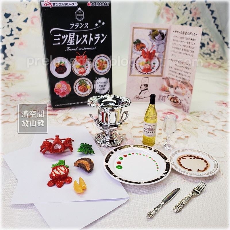 Re-Ment 2008年絕版食玩法國三星餐廳(フランス三ツ星レストラン)。此賣場單售4號。二手有盒有紙。外盒老舊有歲月痕跡,紙盒上下蓋皆已拆有貼編號,盒內側與拆開處有褐色斑。
