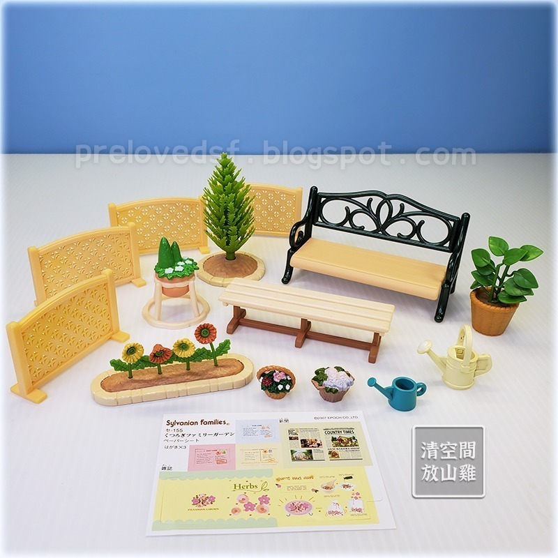 Sylvanian Families 森林家族花園相關配件。皆二手無盒。配件如圖一,不同組合裡的部分配件,不拆售。有的歲月痕跡較明顯,有的不知道是哪一組的配件,附一張未使用的紙配件。