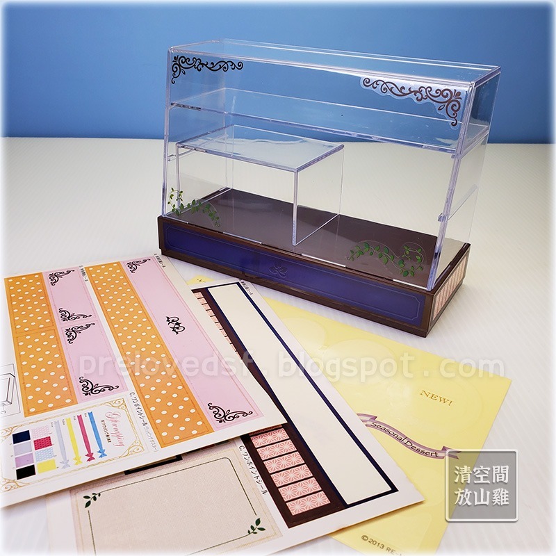 Re-Ment 2013年絕版展示櫃(専用ディスプレイ ショーケース)。二手無盒。局部有刮痕、污漬等痕跡,透明層板 X1、ㄇ形板 X1,少一片層板。展示櫃背面下方有抽屜可拉出。三張貼紙有的已使用,紙型泛黃有斑。