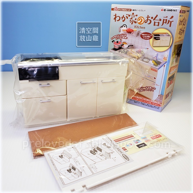 Re-Ment 2016年版本的廚房流理台(わが家のお台所)。二手有盒。外盒盒況不佳有歲月痕跡。兩片板子與紙配件未拆未使用,流理台主體與小配件拆開看過無把玩,小配件沒留原袋。
