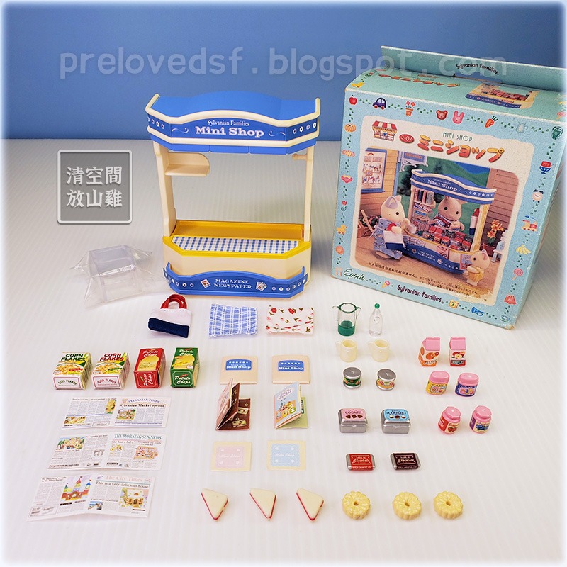 Sylvanian Families Mini Shop 書報攤。二手有盒缺件。這組是 1998年書報攤 Mini Shop 「ミニショップ ミ-07」。外盒老舊有歲月痕跡,這盒比無缺件那盒黃,也比較多污漬,盒背面一處裂開有貼膠帶,點數未剪。