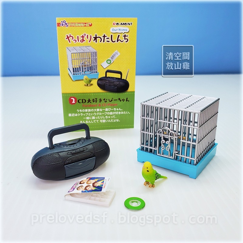 內容物已拆封無留原袋,拍完照會以乾淨袋子分裝。鳥籠的小門可往上拉,非常精緻。CD音響缺天線。