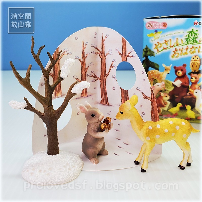 Re-Ment 2008年絕版盒玩森林動物故事(やさしい森のおはなし)10號單售。二手有盒有紙。紙盒上蓋已拆有貼編號,盒有歲月痕跡。10號動物為兔子與小鹿,場景配件是雪景中的樹。