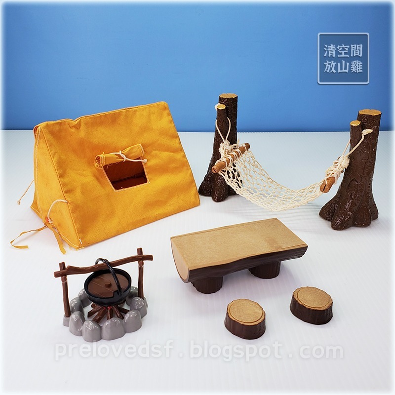 Sylvanian Families 森林家族早期帳篷、營火、樹幹桌椅、樹幹吊床等配件。皆二手無盒,可能是早期1985~1990左右的老物,不確定是哪幾種不同組合裡的配件,不拆售。