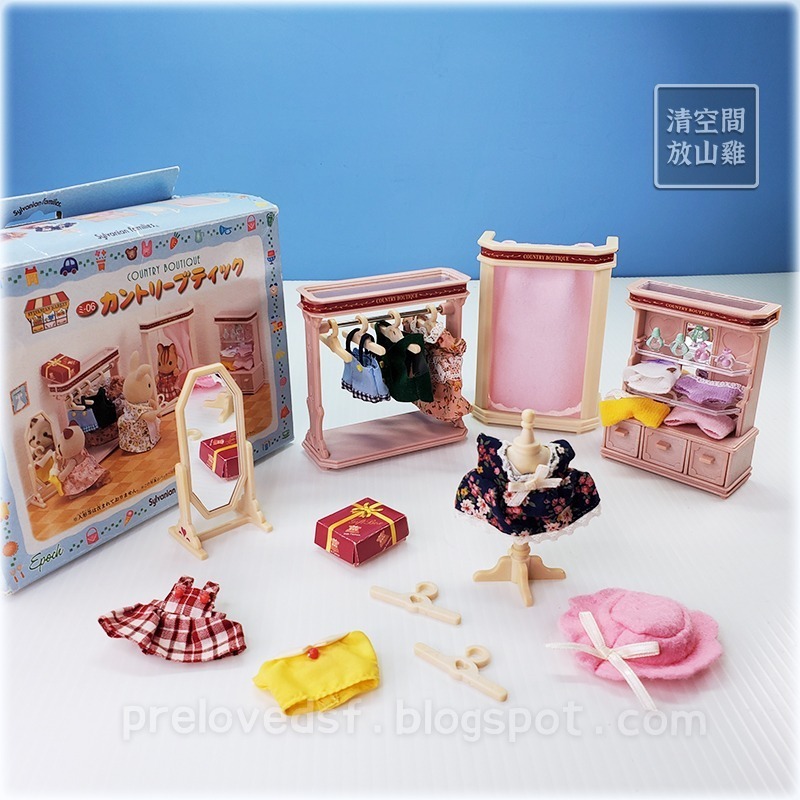 Sylvanian Families 森林家族服飾店配件組合。二手有盒,外盒很舊有磨損、變形、泛黃、髒污等明顯歲月痕跡,點數被剪過。日版1998年的老物,非第一手收藏。