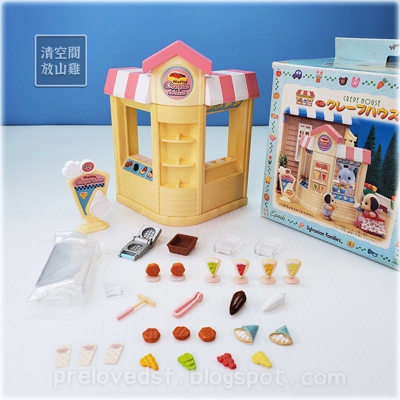 Sylvanian Families 森林家族日版可麗餅店。二手有盒,外盒很舊有破損、磨損、變形、泛黃、髒污等明顯歲月痕跡,點數未剪。日版1999年的老物,非第一手收藏,這組物況不好有缺件,僅適合改造用。