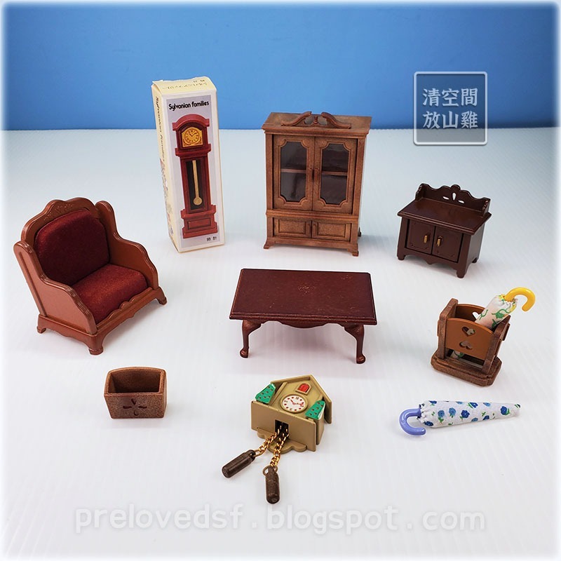 Sylvanian Families 森林家族早期家具配件書櫃、老爺鐘、咕咕鐘、沙發、茶几、傘架、雨傘、電話櫃、雜誌架。如圖一不拆售,老物有刮痕、磨損、污漬等歲月痕跡。