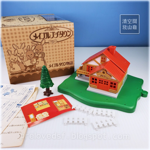1986年《楓葉鎮物語》系列萬代日本製絕版迷你小屋3號雜貨店。二手有盒,盒不完美有膠帶痕、髒污、刮痕、變形等歲月痕跡。內部背景紙卡還在。說明書明顯泛黃有斑。