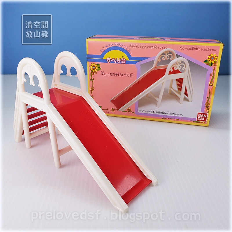 1985年 BANDAI 日本製《みんなのお家》系列家具配件,紅色溜滑梯 X1。二手有盒,盒老舊有膠帶痕、髒污、黃斑、變形等歲月痕跡。