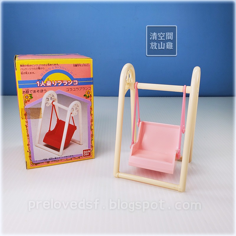 1985年 BANDAI 日本製《みんなのお家》系列家具配件,粉紅色單人盪鞦韆 X1。二手有盒,盒老舊有膠帶痕、髒污、黃斑、變形等歲月痕跡。