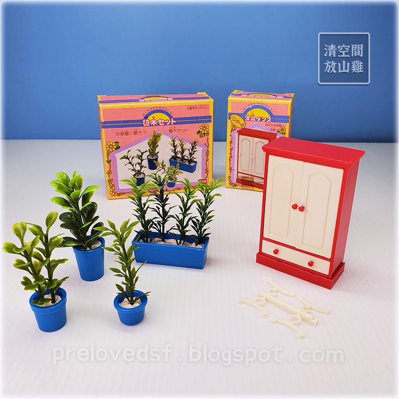 1985年 BANDAI 日本製《みんなのお家》系列家具配件,紅色衣櫃、盆栽組。兩組皆二手有盒,盒非常老舊有膠帶痕、髒污、黃斑、變形、泛黃等歲月痕跡。