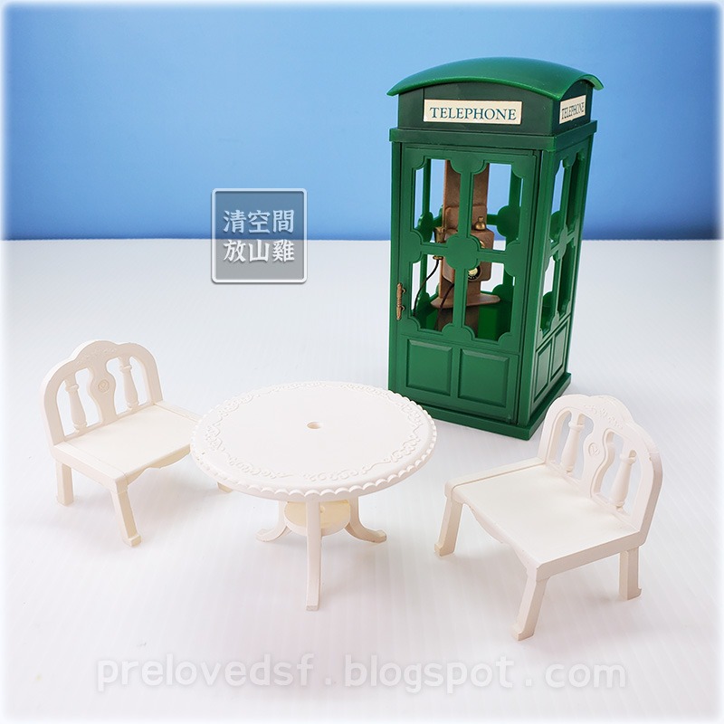 Sylvanian Families 森林家族早期絕版綠色電話亭X1、桌子X1、椅子X2。皆二手無盒有歲月痕跡。