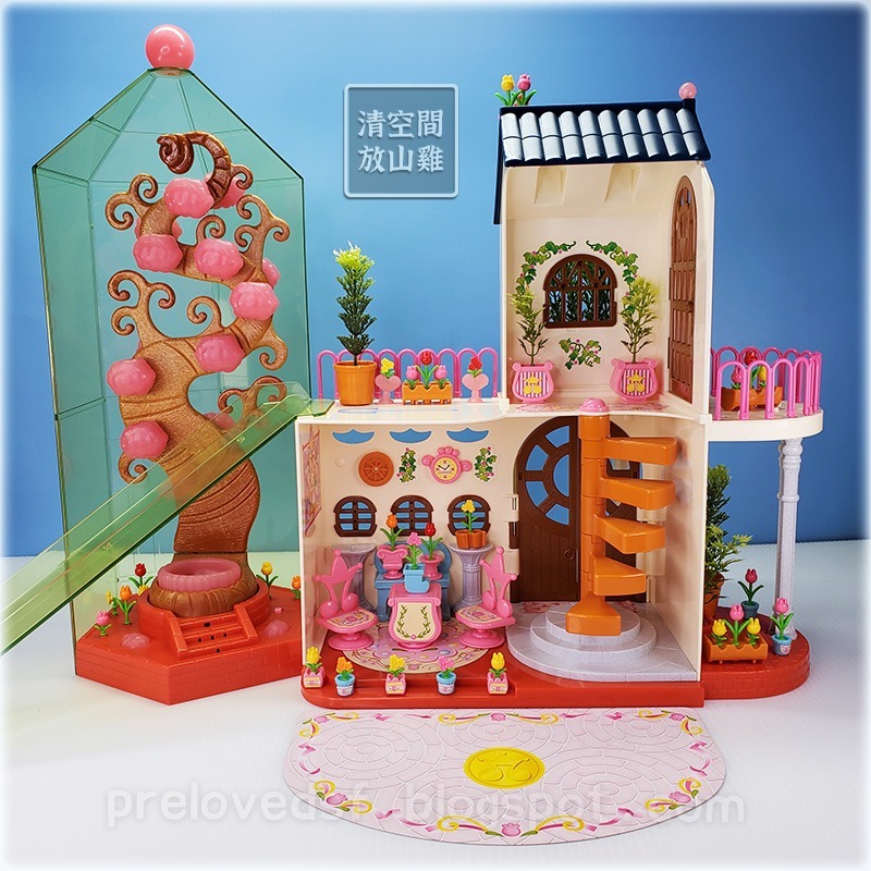 其中粉紅色微透材質的配件出油會黏,建議不玩時另外收納。黃綠色透明罩與溜滑梯局部有刮痕磨損。綠色假植物是軟材質歪歪變形。盆栽的小貼紙不太黏已翹起可能會脫落。