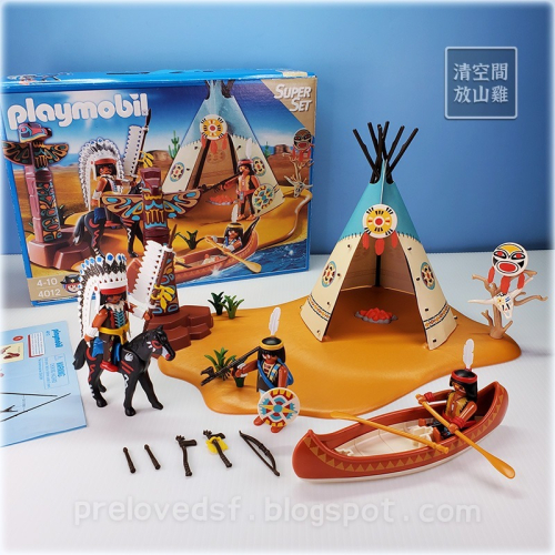 Playmobil 4012 摩比印地安營地,約2011年的摩比。二手有盒,盒況老舊破損變形。紙盒原本全拆壓扁長期收納,重組後內側以膠帶固定,盒控請勿下單。