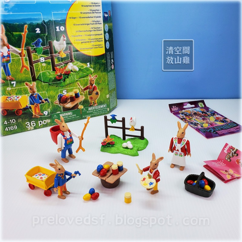 Playmobil 4169 摩比復活節兔子降臨曆,約2014年的摩比。二手無盒,只有留兩大張局部盒圖,紙況不佳有破損、污漬等歲月痕跡。