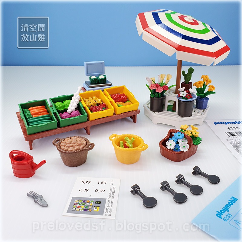 Playmobil 6335 摩比水果蔬菜與花卉攤位組,約2014年的摩比。二手無盒,原為袋裝產品,原袋已丟,商品貼有留。