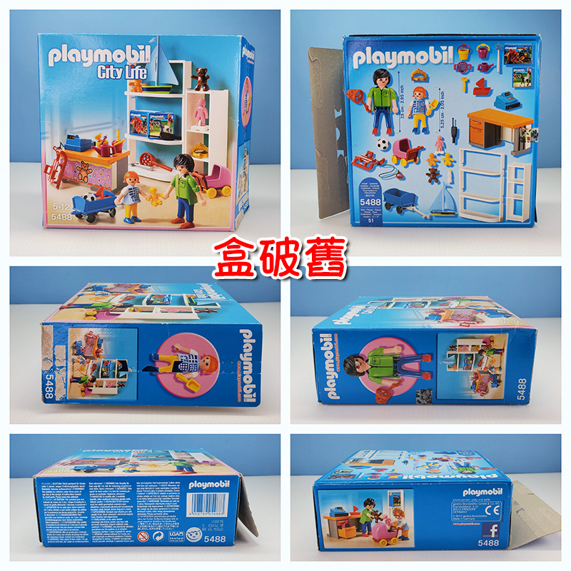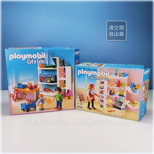Playmobil 5268 摩比飯店商店,約2012年的摩比。Playmobil 5488 玩具商店,約2013年的摩比。兩組皆二手有盒,盒況老舊破損變形,紙盒原本全拆壓扁長期收納,盒控請勿下單。