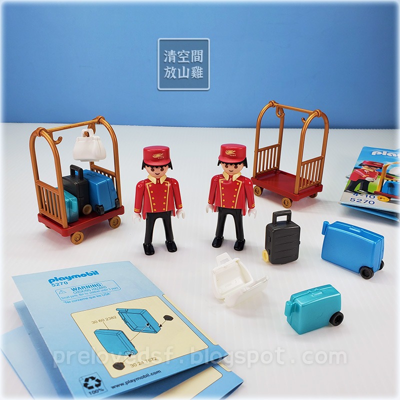 Playmobil 5270 摩比飯店行李服務員2組,約2012年的摩比。二手有盒,盒況老舊變形,紙盒原本全拆壓扁長期收納,不會恢復成盒子狀態,僅以壓扁狀態裝袋,盒控請勿下單。