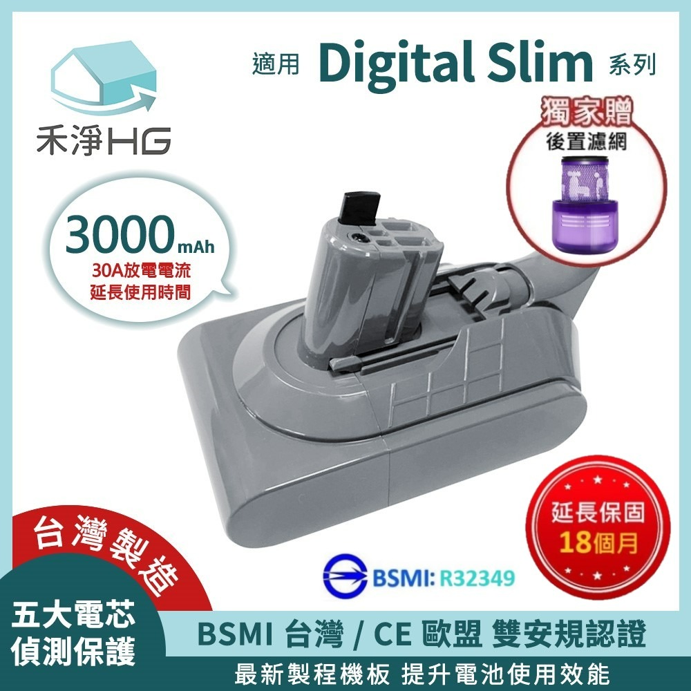 商品名稱:【禾淨家用HG】 Dyson戴森 適用Digital Slim SV18.SV52 CL1830 3000mAh 副廠吸塵器配件 鋰電池(贈後置濾網)