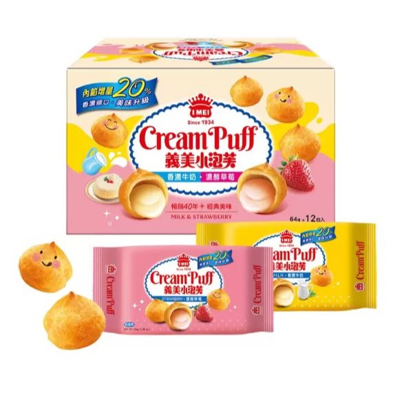 品名 : 義美 小泡芙(香濃牛奶+濃醇草莓) 64公克 X 12入