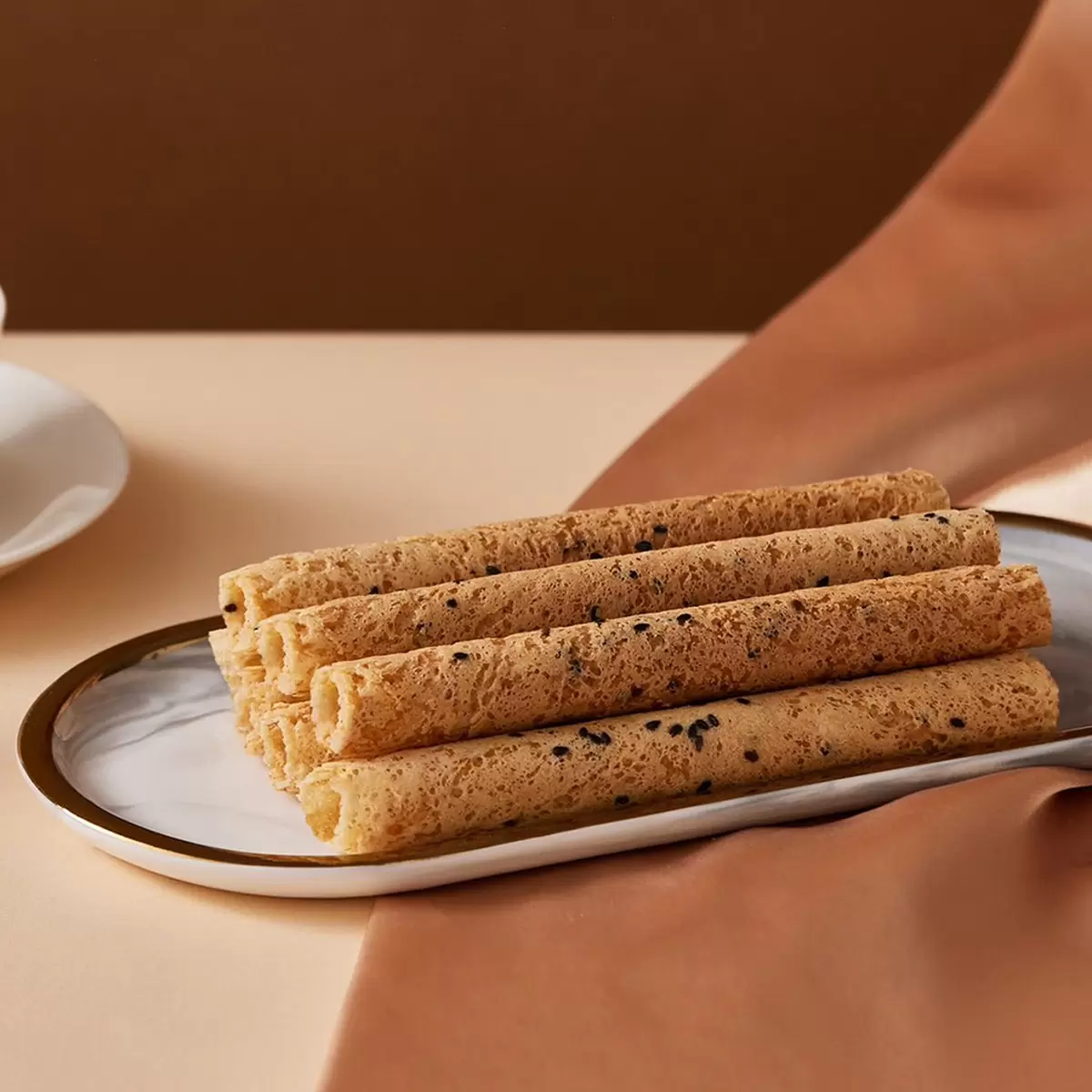 • 蛋香濃郁的酥脆蛋捲搭配精選黑芝麻粒,層層口感,香氣十足。