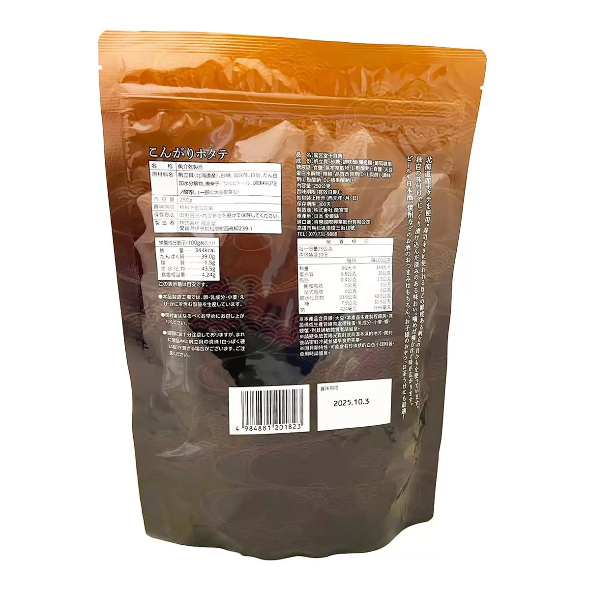 成分 : 帆立貝、砂糖、調味醋(釀造醋、葡萄糖果糖液糖、食鹽、昆布萃取物、L-麩酸鈉)、食鹽、大豆蛋白水解物、辣椒、調味劑(L-麩酸鈉、DL-蘋果酸鈉)、品質改良劑(D-山梨醇)