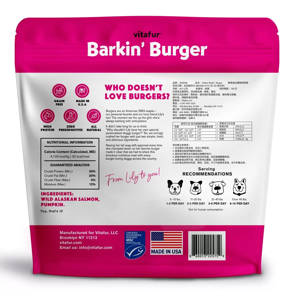品名 : Vitafur Barkin' Burger 鮭魚南瓜寵物狗零食 453公克