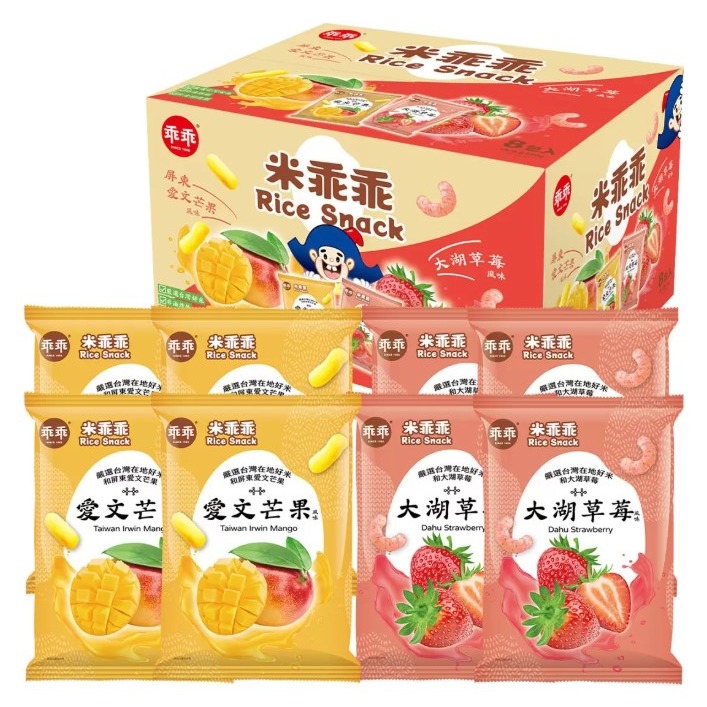 - 精心嚴選屏東愛文芒果及大湖草莓,結合台灣在地好米製成的米乖乖,品嚐得到濃郁的酸甜果香、獨有的米香及爽脆口感,帶來最豐富的味蕾體驗!