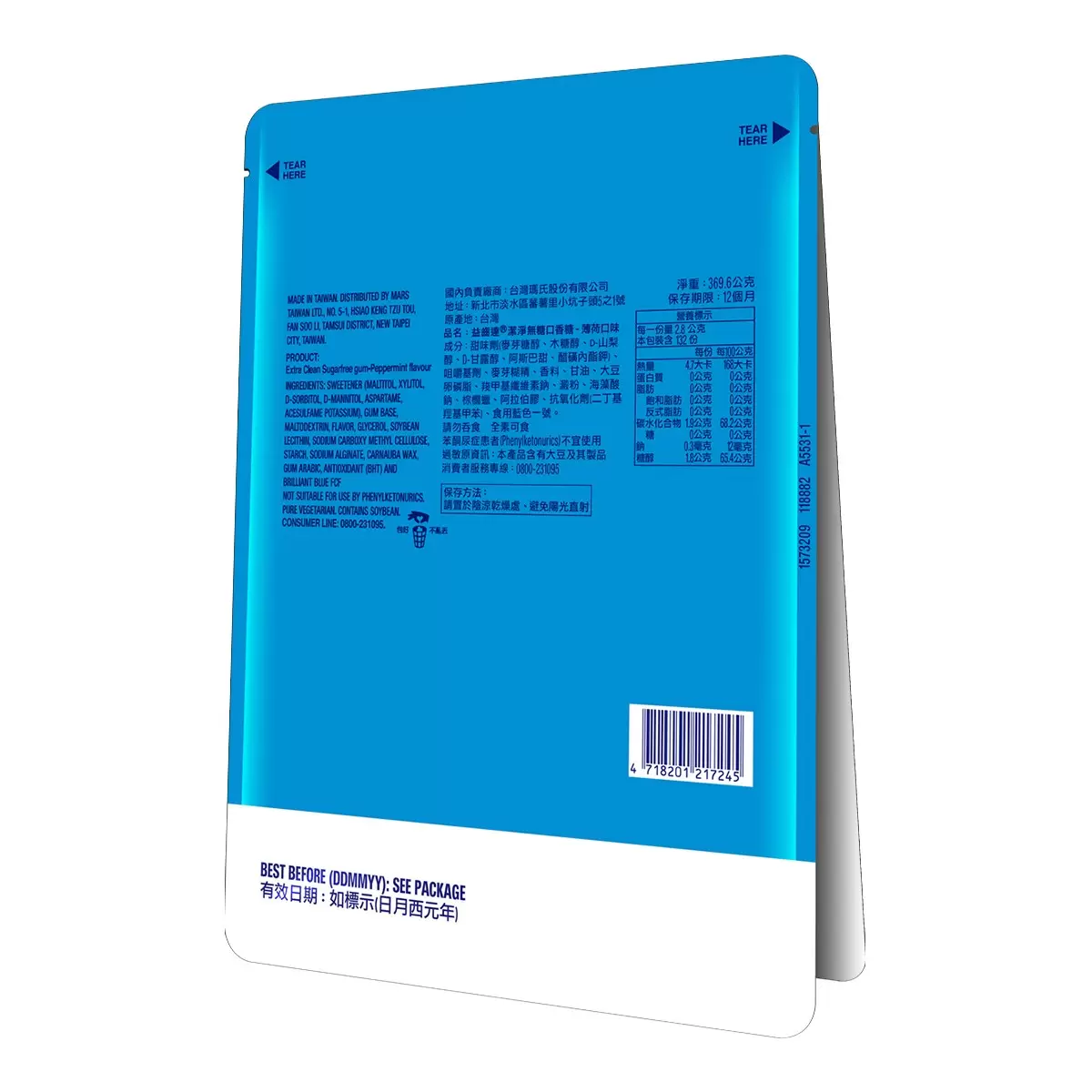 | 成分 | 甜味劑(麥芽糖醇、木糖醇、D-山梨醇、D-甘露醇、阿斯巴甜、醋磺內酯鉀)、口香膠、麥芽糊精、香料、甘油、大豆卵磷脂、羧甲基纖維素鈉、澱粉、海藻酸鈉、棕櫚蠟、阿拉伯膠、抗氧化劑(二丁基羥基甲苯)、食用藍色一號 過敏原資訊: 本產品含有大豆及其製品本產品含有大豆及其製品 |