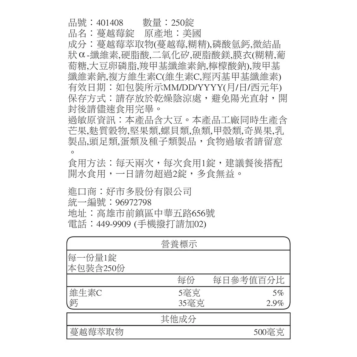 | 成分 | 蔓越莓萃取物(蔓越莓,糊精),磷酸氫鈣,微結晶狀α-纖維素,硬脂酸,二氧化矽,硬脂酸鎂,膜衣(糊精,葡萄糖,大豆卵磷脂,羧甲基纖維素鈉,檸檬酸鈉),羧甲基纖維素鈉,複方維生素C(維生素C,羥丙基甲基纖維素) |