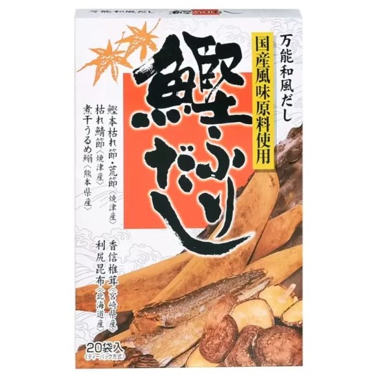 | 成分 | 食鹽、砂糖、鰹節魚粉末、沙丁魚粉末、鯖節魚粉末、鰹節魚高湯顆粒(食鹽、砂糖、玉米澱粉、洋蔥粉末、鰹節魚粉末、酵母萃取物、大豆水解蛋白、L-麩酸鈉、5’-次黃嘌呤核苷磷酸二鈉、5’-鳥嘌呤核苷磷酸二鈉、琥珀酸二鈉)、醬油粉末(糊精、醬油、食鹽、砂糖)、香菇粉末、昆布粒、油菜籽油、調未劑(L-麩酸鈉、5’-次黃嘌呤核苷磷酸二鈉、5’-鳥嘌呤核苷磷酸二鈉、琥珀酸二鈉)、乳酸鈣。 |